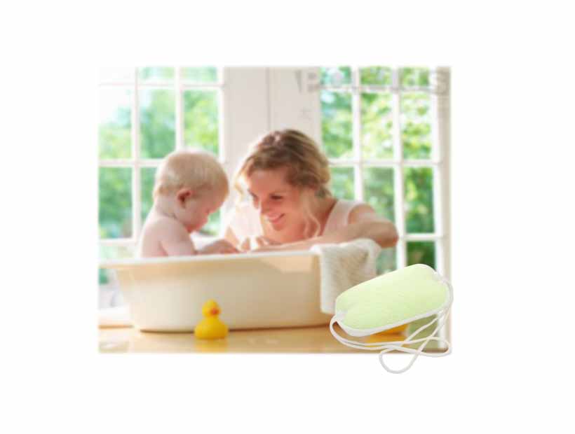 ボディースポンジをお湯で膨らませ、